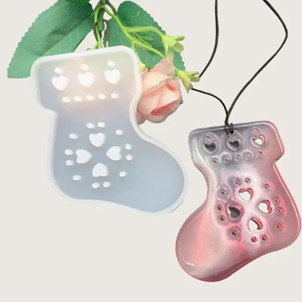 Un molde de silicona con diseño de bota navideña con orificio para colgante.